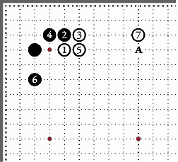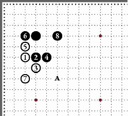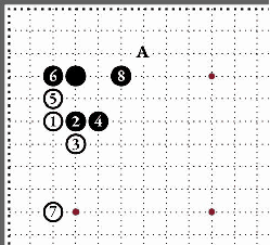 Другое прочтение дзёсэки. Белые камни собраны в кулак для активной игры против чёрных. Защитная постановка чёрных 8 в ответ на белый камень 7 – обязательна. Иначе чёрному отряду грозит разделение на части. Белые могут занять перекрёсток А, накапливая влияние. |