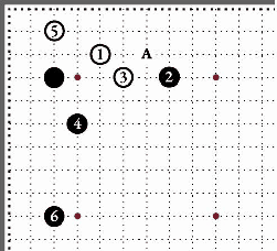 6. Здесь белые строятся в углу, уходя от борьбы, а чёрные – на стороне. В будущем чёрным выгодно занять перекрёсток А, начав атаку на белый отряд в углу. |
