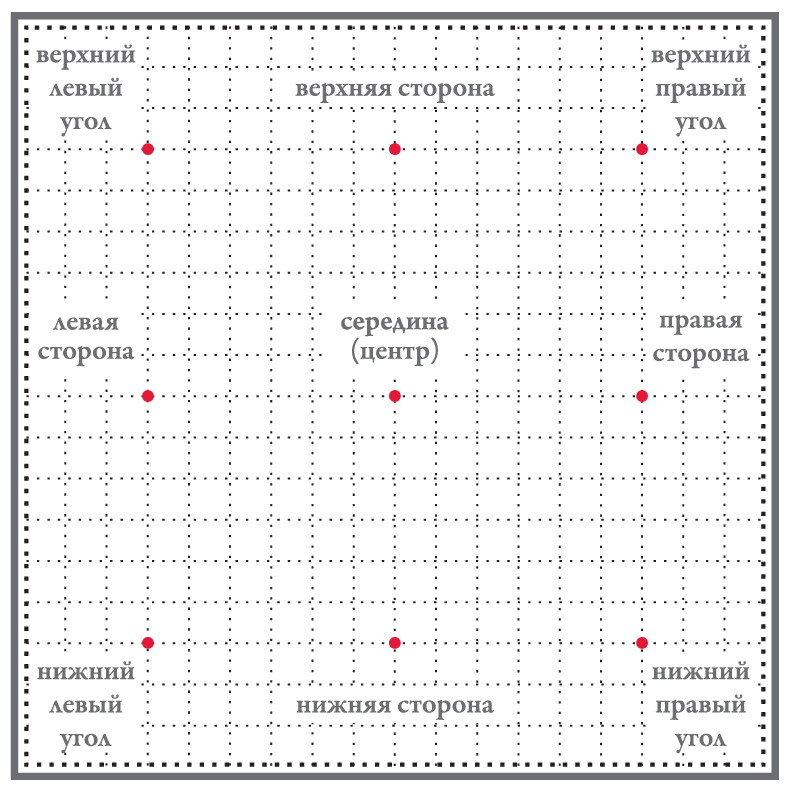 На игровом поле принято различать четыре угла, четыре стороны и срединную часть (зарисовка 3-1).