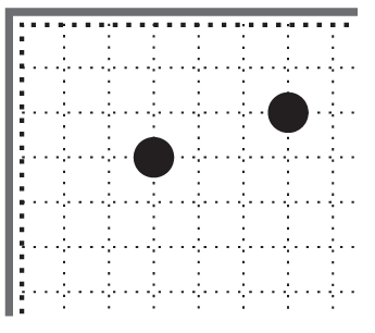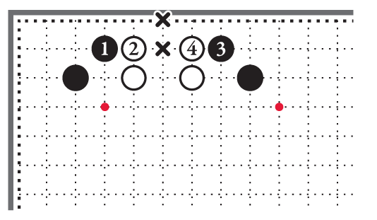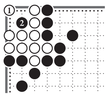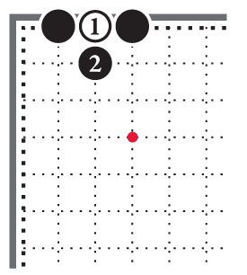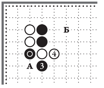 Определим положение чёрных и белых камней на игровом поле зарисовки 3-2. Чёрный камень 1 стоит в верхнем левом углу на первой линии. Русский Учитель называет её «линией смерти».