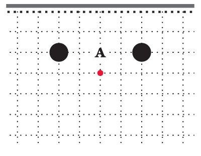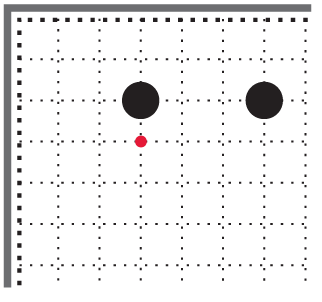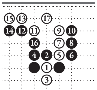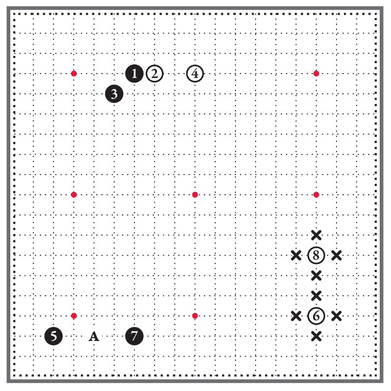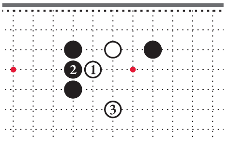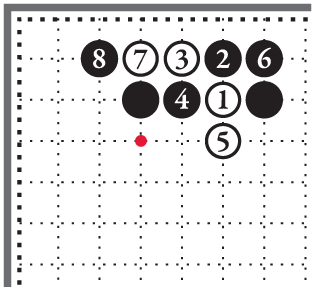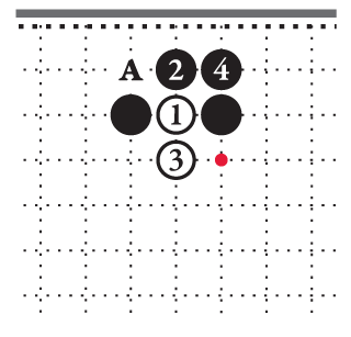 Чёрные камни 5 и 7 на третьей линии отстоят друг от друга на три шага [8]. В отличие от двух белых камней справа, такая стойка чёрных неустойчива. Чёрные камни не соприкасаются своими дыханиями. Если поставить белый камень на перекрёсток А, он разделит стойку чёрных и при этом полностью сохранит свои дыхания.