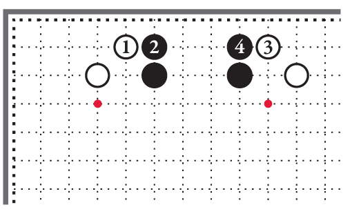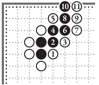 [17] Важно отметить, что в любой момент белые могут отделить два чёрных камня на правой стороне от камней в углу. Поэтому мы с большой натяжкой относим их к одному отряду. Причина такого допущения в том, что чёрные в любой момент сами могут разделить белые камни на правой стороне.