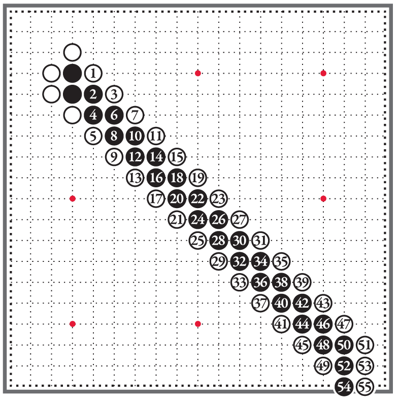 Трудность же заключается в том, чтобы противник не разгадал замысел и цель вашего построения. Ведь доска Го открыта, на ней нет лесов, оврагов и потайных мест. Противник осматривает её столь же тщательно, как и вы. Заметив так называемый «стандартный строй», он успеет поставить защитные камни, и вся подготовка уйдёт насмарку.