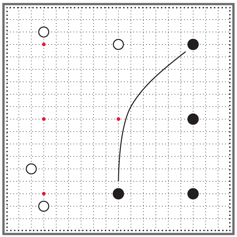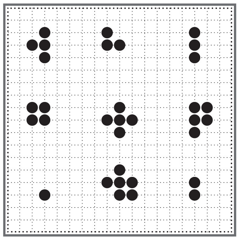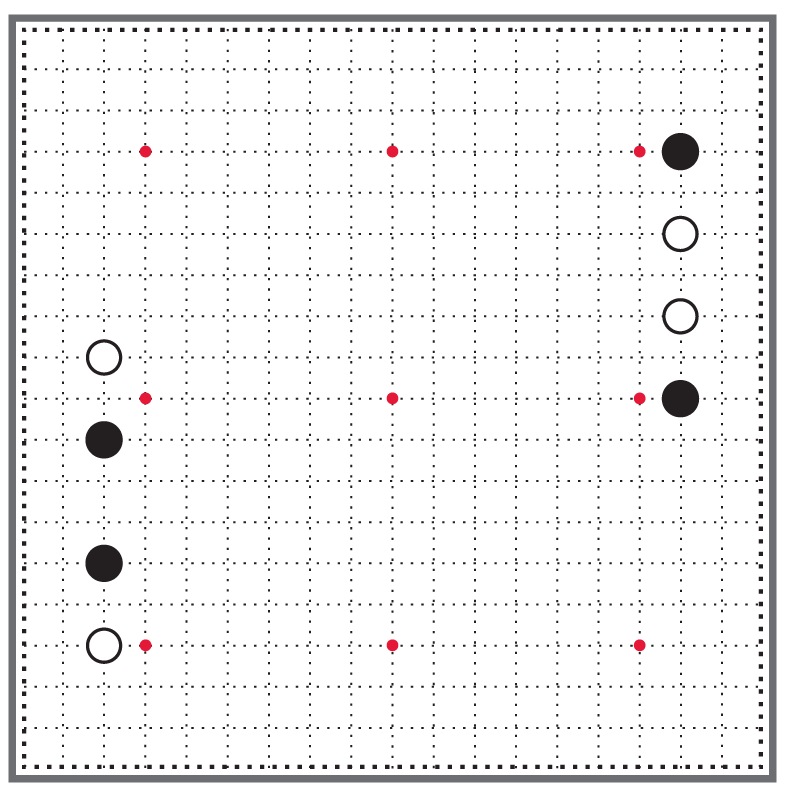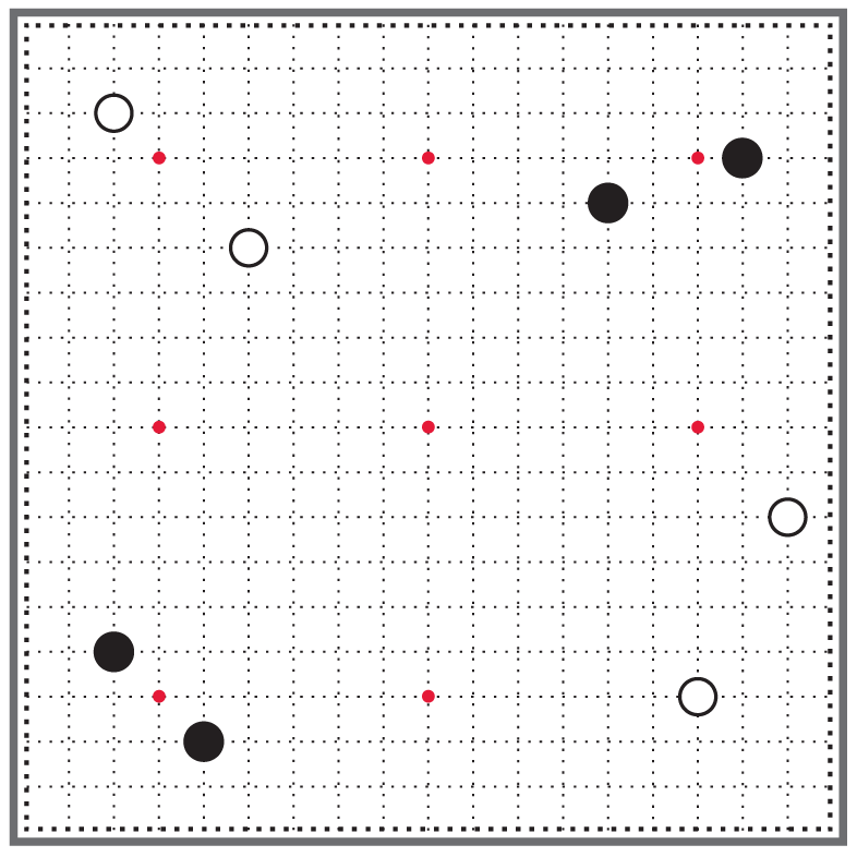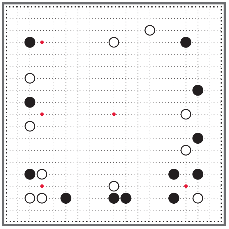 Плотность построения белых камней неравномерна. Белые камни сосредоточены в углах, а на стороне остается огромный разрыв [15]. Видно, что белым не хватает ещё одного камня в середине левой стороны, чтобы все белые камни объединились для совместной работы. В построении белых нет полноты, им ещё не удалось преодолеть отставание в развитии.